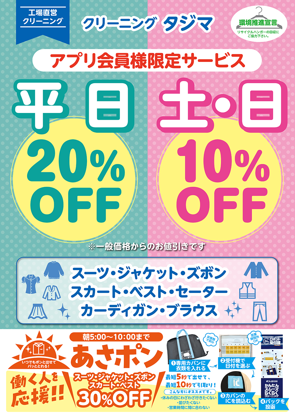 さらに、毎日の暮らしを支える便利な大型コインランドリーや、アプリ連動型の24時間無人受付システムも導入。日常使いから特別なお洋服まで、幅広いニーズにお応えしています。