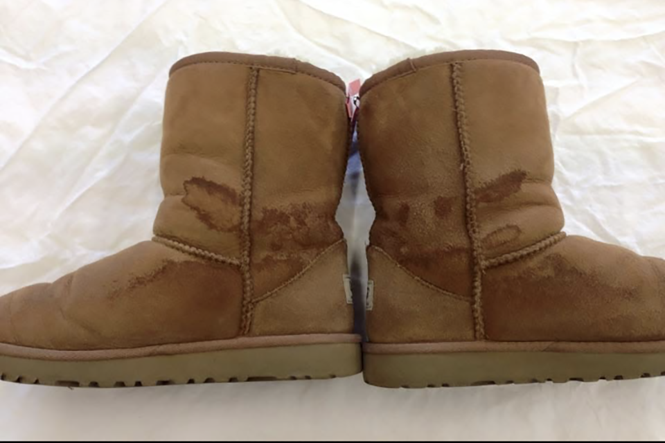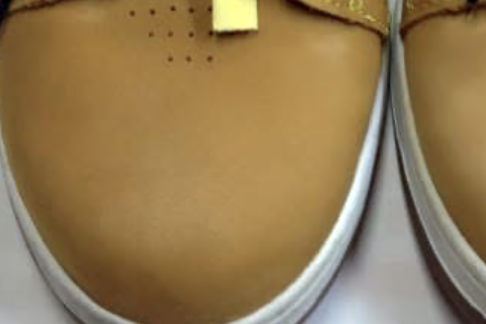 全体補色(ソールの黄変を白くする補正込み)。洗い後、全体的な色ハゲ、色あせを補色します。
